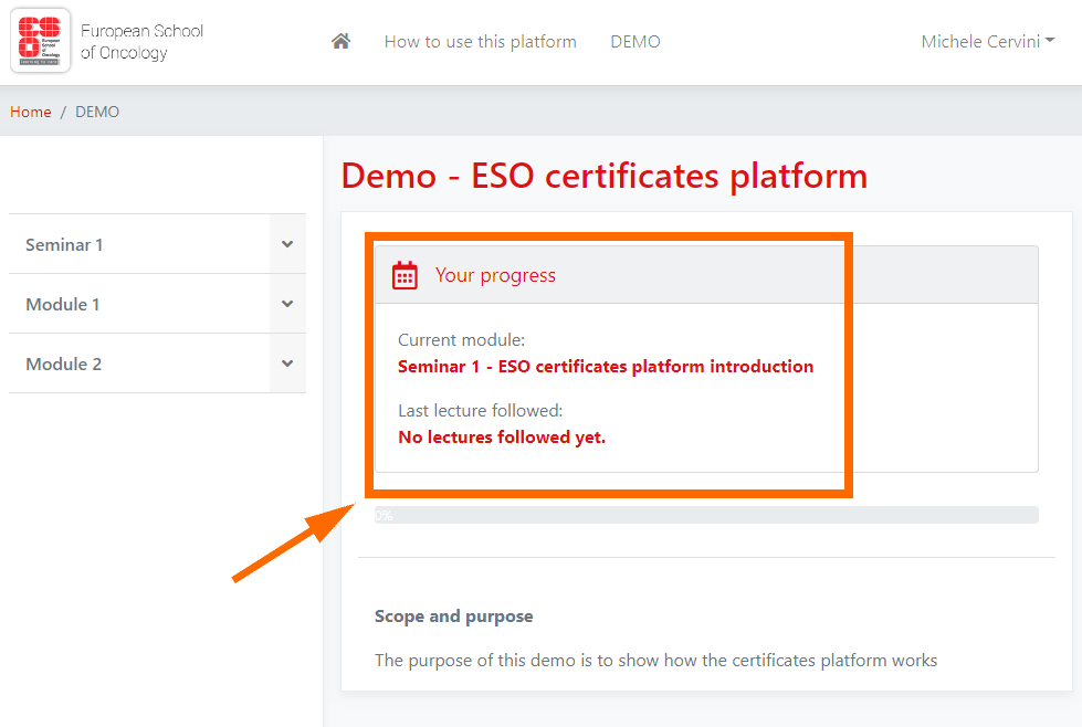 Just above the course description you can see your current progress in the course program.